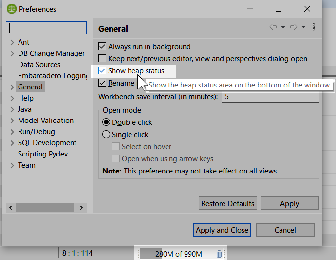 You can view the Heap status by checking the Show Heap Status checkbox from the application preferences (Tools/Preferences menu).