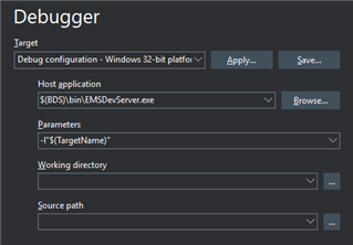 Figure 11: Run | Parameters… dialog showing EMSDevServer.exe as the Host application
